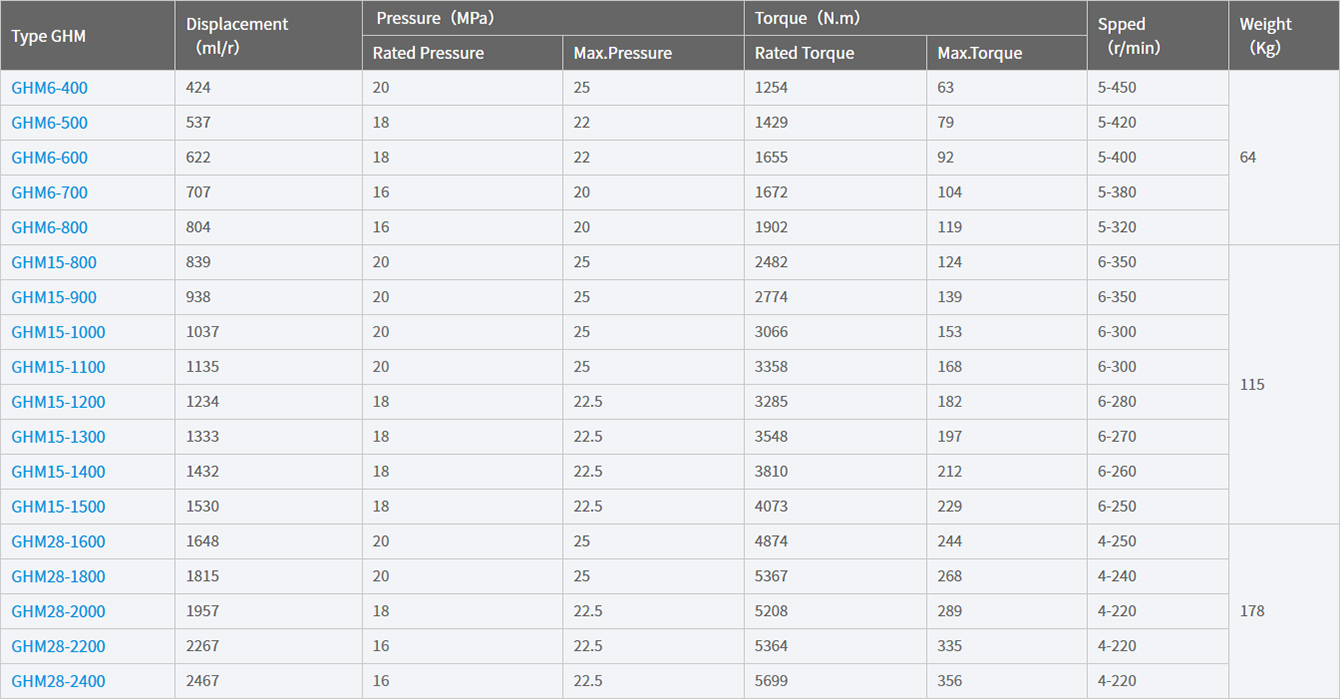 1. The piston does not experience lateral forces with the swinging cylinder, and the bottom of the piston is designed for static pressure balance. Torque is transmitted between the piston and the crankshaft via rolling bearings, which reduces friction losses during the transmission process. Therefore, the GHM series hydraulic motors have very high mechanical efficiency and high starting torque (with mechanical efficiency exceeding 92% at startup).