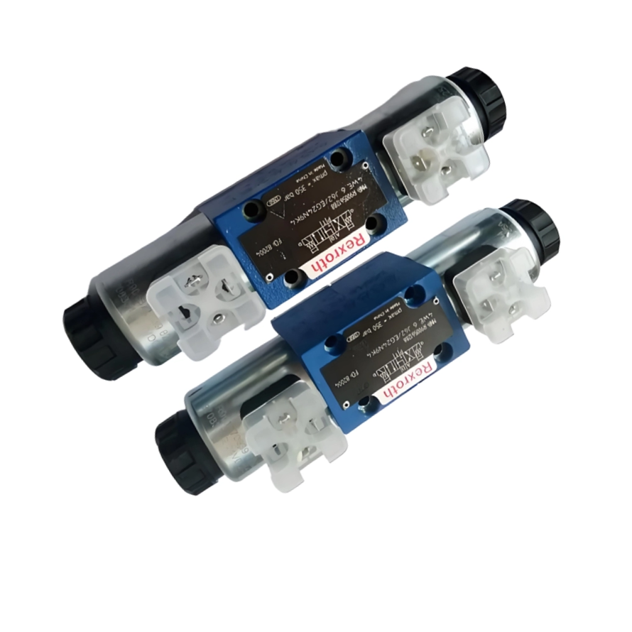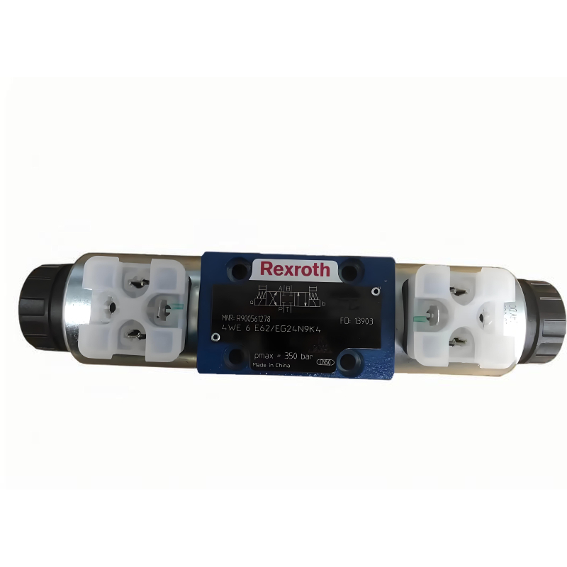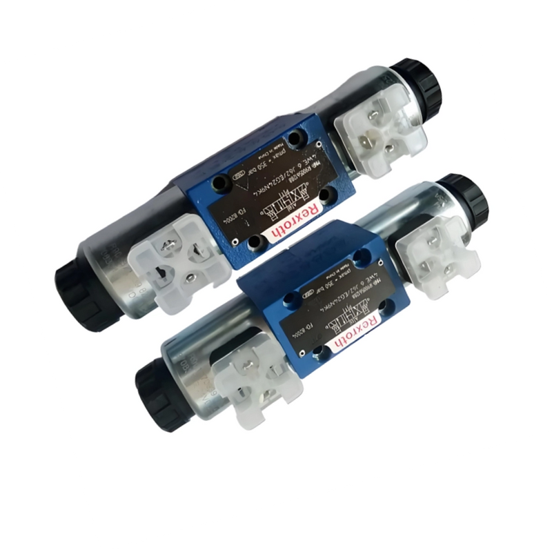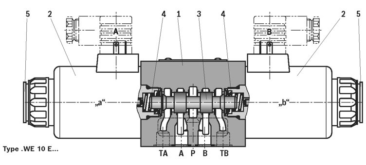 The directional valves of type WE are solenoid-actuated directional spool valves that can be used as electro-hydraulic component. They control the start stop and direction of a flow. The directional valves basically consist of the housing(1),one or two electronic solenoids(2) the control spool(3),and the return springs(4).In the de-energized condition, the control spool(3)is held in the central position or in the initial position by the return springs(4)(except for version "O").If the wet-pin electronic solenoid (2) is supplied with power, the control spool(3) moves out of its rest position into the required end position. In this way, the required direction of flow according to the selected symbol is released. After the electronic solenoid (2) has been switched off, the control spool (3) is pushed back into its central position or into its initial position (except for valves with "OF" detent and valves without type "O" spring).A manual override (5) allows for the manual switching of the valve without solenoid energyzation.