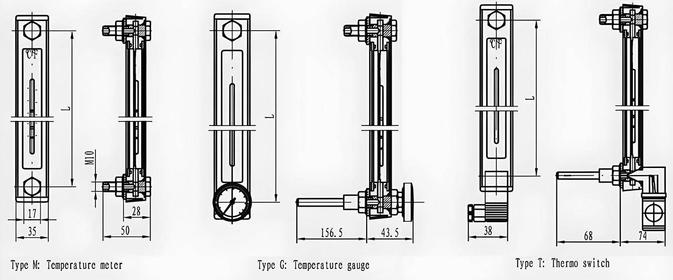 According to the center distance (E) size of the selected specifications, prepare two mounting holes. For cases where the wall thickness of the oil tank is less than 10mm, the clear hole for the two mounting screws should be 11mm; if the wall thickness is greater than 10mm, the threaded hole for the two mounting screws should be M10. The surfaces of these two types of holes must be treated to prevent oil leakage after installation. Accessories for the liquid level gauge: two each of nuts, washers, and sealing flat washers, all provided by our company.